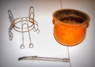 If you’ve been to Argentina or its neighboring countries, then you’ll know that mate is a type of tea (different family, probably; I’m not being technical here) served in a recipient made from hollowed gourd, called, also, mate. This is stuffed with the leaves, hot water is poured in it, and you drink it through a metal straw called “bombilla” (also pictured above). It’s a social drink: once you’ve drunk, the host fills it up again, and passes it to the next guest (drinking, yes, from the same bombilla).